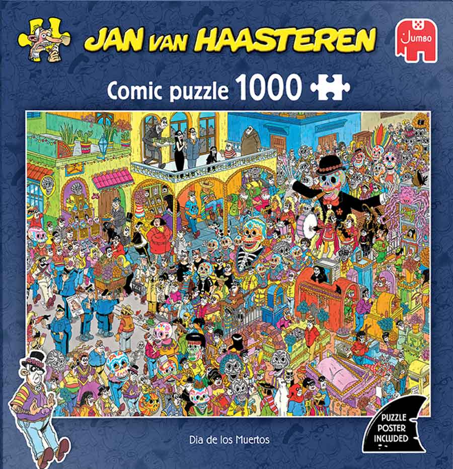 De familie Jan van Haasteren viert Dia de los Muertos. Het is een traditie in Mexico waarbij families de zielen van hun overleden familieleden verwelkomen. Het wordt een dag vol eten, drinken en muziek. Vind jij de gezinsleden in dit kleurrijke decor?